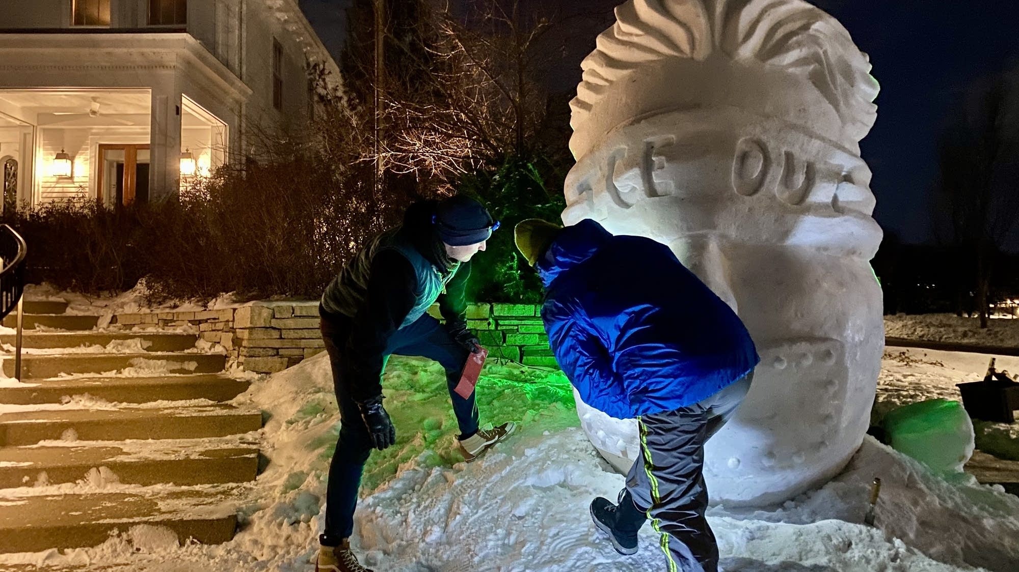 A new snow sculpture in Minneapolis features the face of Renee Macklin Good with a blindfold that says “ICE OUT,” and it references two snow sculptures that were disqualified from competitions last month for their references to ICE the surge.